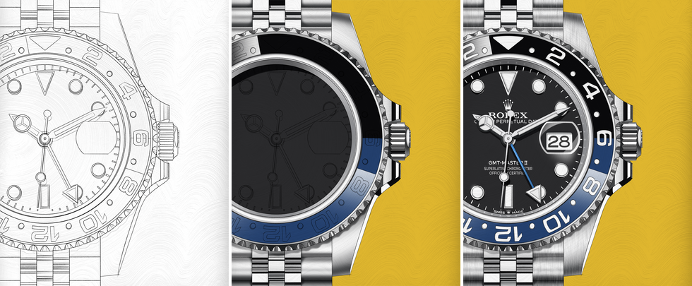 Illustration of the Rolex GMT-Master II, also known as the “Rolex Batman” because of the black and blue colour scheme.